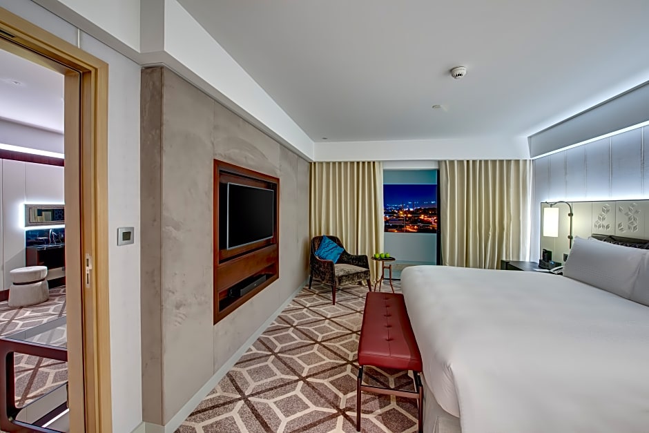 King bed room featuring views over the Hajar mountains or the city with access to club lounge, this air-conditioned room features a balcony, a working desk, a safe and a mini-bar
